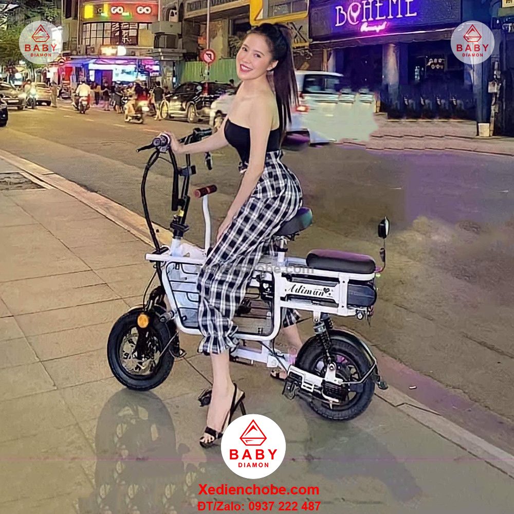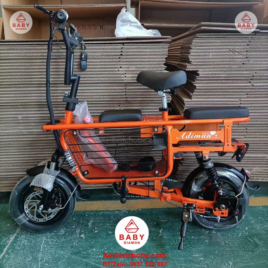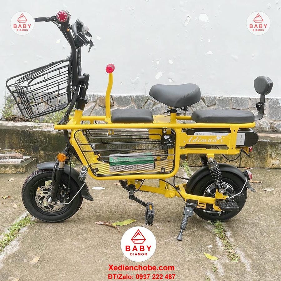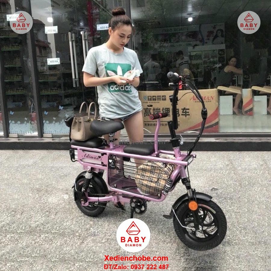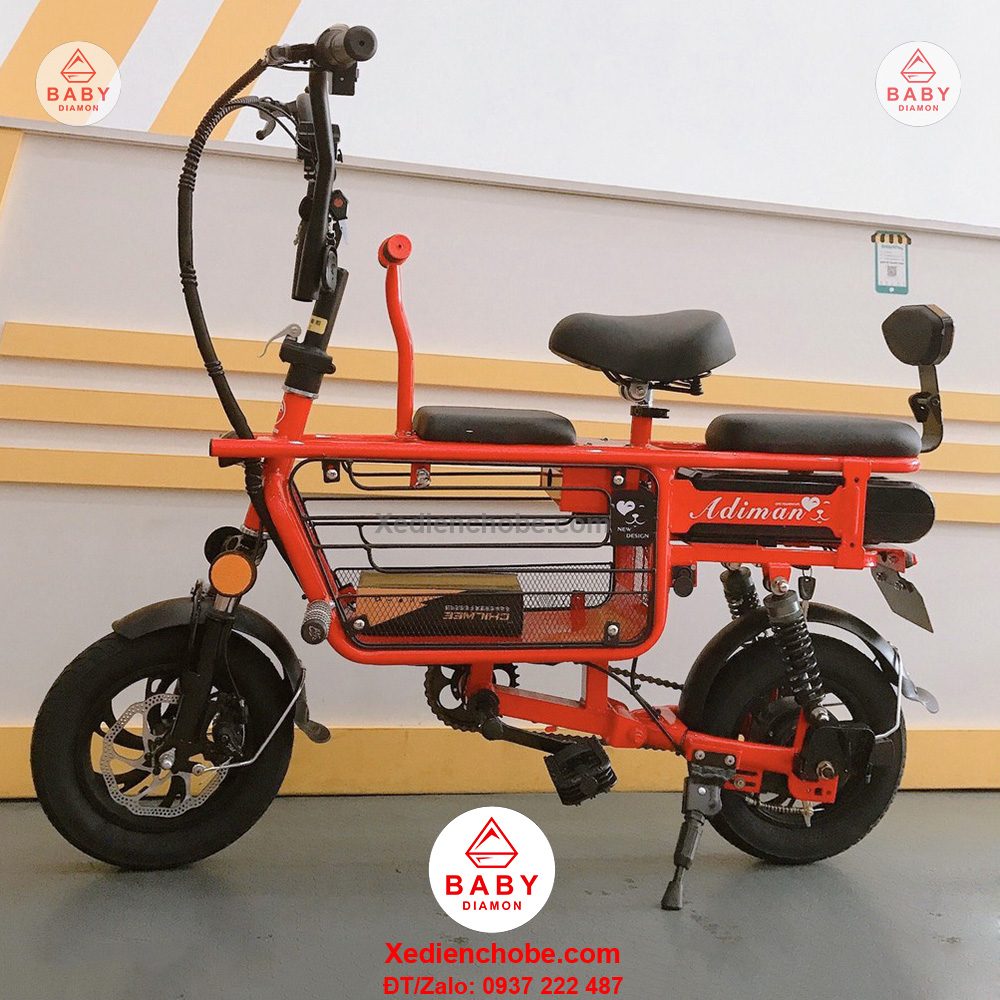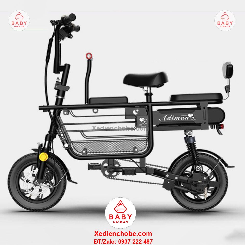 Xe đạp điện cho mẹ và bé Adiman, 3 yên ghế là dòng xe đang làm mưa làm gió trên thị trường hiện tại cùng với dòng Burke, Lihaze, Theli, màu sắc tươi tắn, nhẹ nhàng, kiểu dáng xe thể thao, nhỏ gọn, nay có thêm phiên bản 3 ghế ngồi, giúp mẹ và bé có thể chơi vui hơn, thích hợp cho mẹ và bé dưới 100 ký, xe hoạt động tốt nhất với bé 80-90 kg, sử dụng pin lithium, động cơ mạnh mẽ, kết hợp với bàn đạp, pin 15ah, vận tốc tối đa 25-35km/h, quãng đường di chuyển khoảng 40-50km, chất lượng hoàn hảo